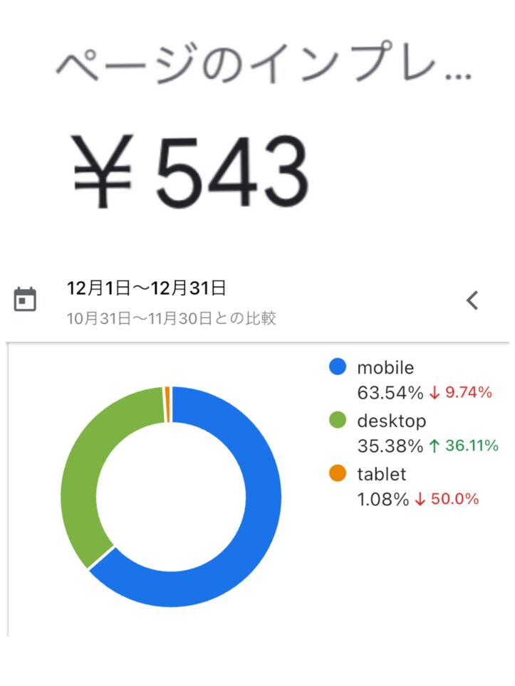 ページインプレッションという数字が「1000pvあたりの収益額」でして、年末フィーバーの日はつまり「1000pvで543円もらえる計算の日」がありました、夢のような数字!普段は160~170円に最近は上がって来ていて(去年周年の時は120円前後と言っていたので+35%の増加!)、1リンク踏んですぐ帰っちゃうということは減り、ちゃんと読んで貰えていることが分かるのですが、PCだとその仕様上サイドバーの広告も読み込むから長文記事の私のブログではそこでの加算がえぐいのかなと予想したのですが、果たして……