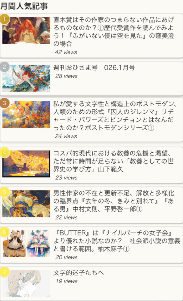 【5位】12月末に投稿した男性不在①、おそらくあまり読まれないだろうなと書いたので、意外と読まれて安心。社会性が強く、文芸性は弱めの記事となっていて、こういう記事がどう読まれるのか、が個人的には今後の試金石になるのかなと思っているので、少しは安堵。