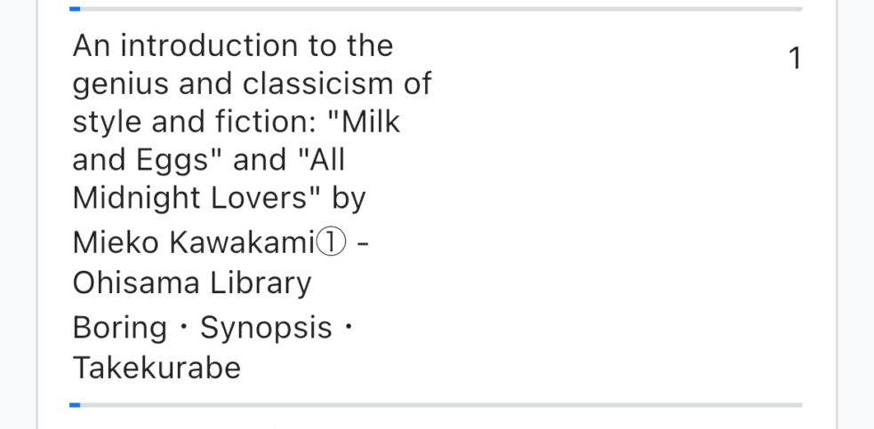 おそらく日本語タイトル+英文の場合は、日本語検索なのか英語検索なのかの判断は難しいのですが、全文英語タイトル反映の場合はおそらく英語圏からの検索で、英単語seoをしてから川上未映子①に2件の全文英語タイトル流入が発生、そこから国内作家でも海外的に読まれている=検索流入の価値可能性が高い記事として、川上未映子・多和田洋子・小川祥子・村田沙耶香の記事タイトルと検索seoを若干。これらのことから、