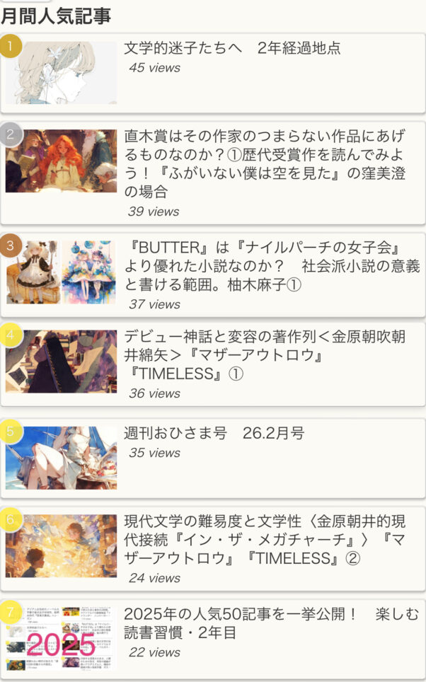 2月の新記事かつ3週目の投稿なので、月末までの7日で一気に読まれたことになります、ごぼう抜きありがとうございます。「文学的迷子たちへ」という言葉はブログ開設時から使っている言葉で、常に私の状態、そして現代文学の状態、多くを内包する的確かつ詩的な言葉で、気に入っています。