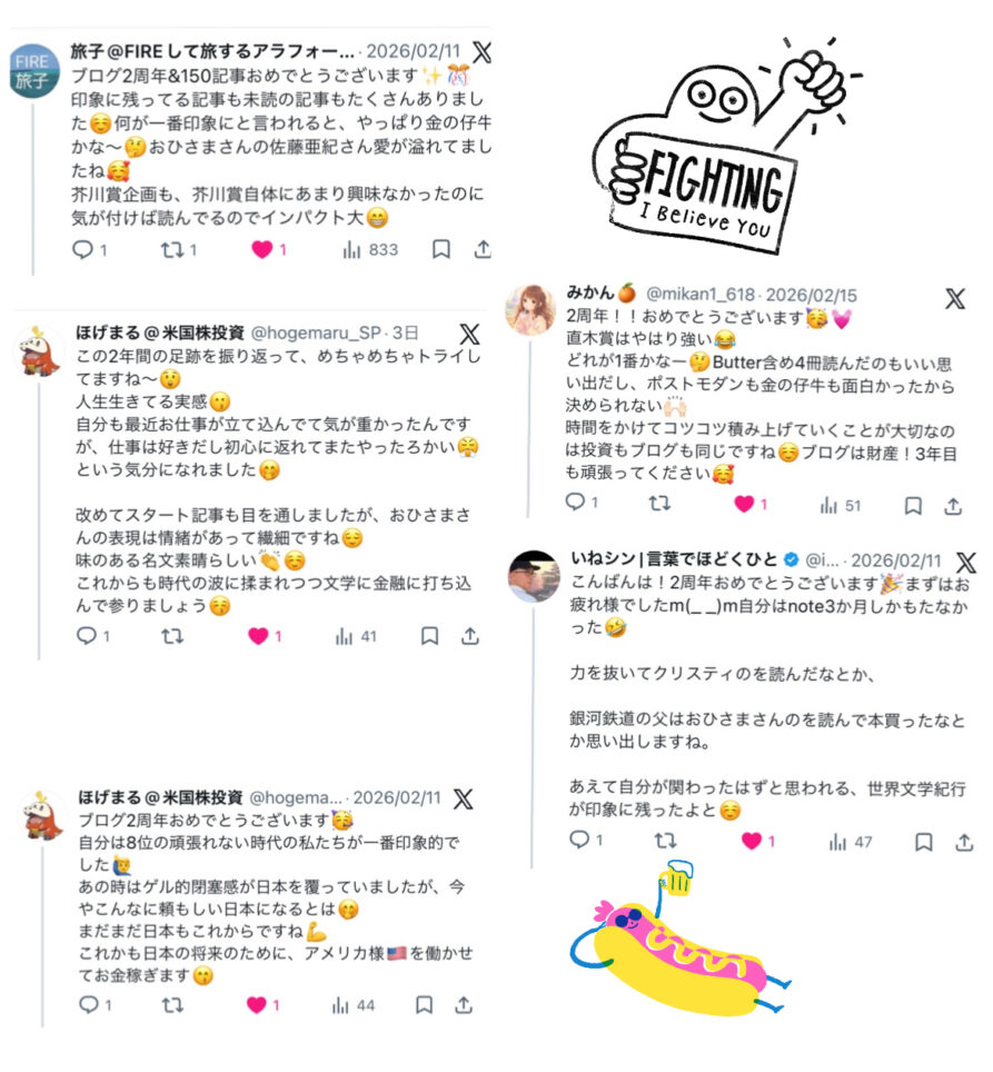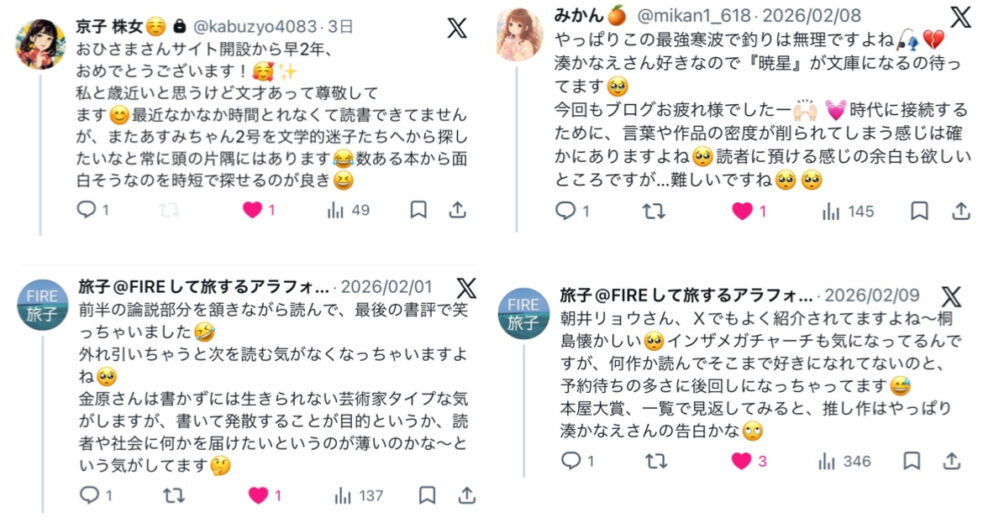 今回は周年記念/セミリタイア=読書経過2年地点のお祝いに駆けつけてくださった方も多かったので、うれしいミニコメントが続々。そして今月も旅子さんがたくさん引用や読書してくれてうれしかったし、特大コメントに歓喜😊❤ 芥川賞企画を一緒に楽しんでくれた自分以外の一人がいて半年感走ってきた感じも感極まります😊
