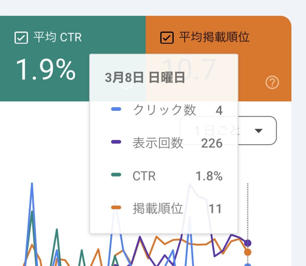 「そっか、表示が結構あるし順位も11位と結構上なのに、lick全然されていないな😿」と思っていましたが、1枚目の画像の見方を加味すると、「日本での表示は7288回あるけど順位は14.5位だからクリック率が3.7%は健闘している方」(=タイトルが悪いわけではない)、ということが分かります。