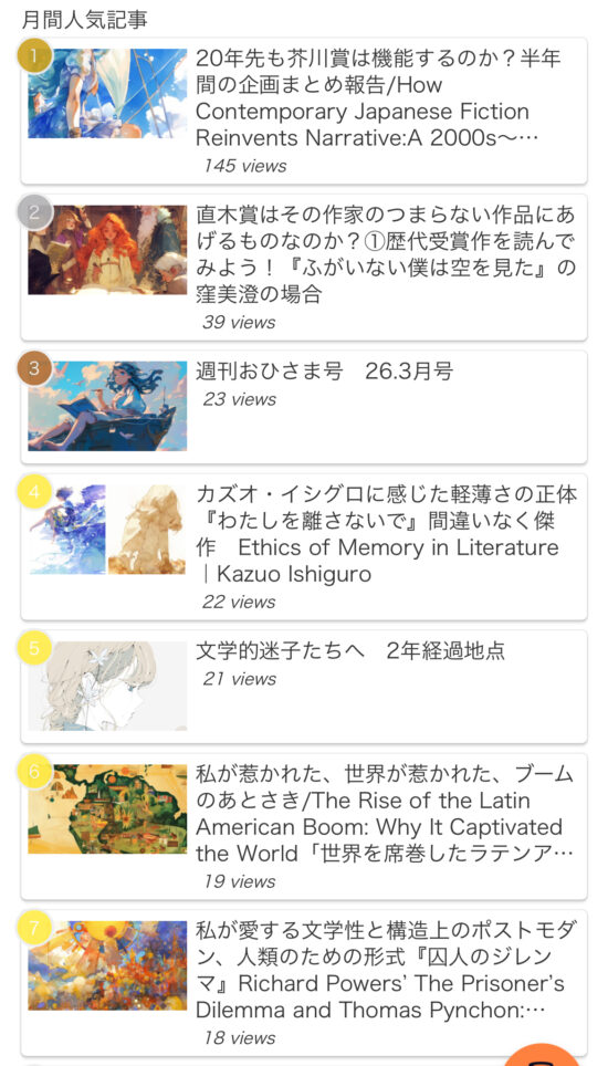 3月は287pv(平均41.0)、成長率は+21.1%と鈍化ですが、3月は新記事が2つと恐ろしい月となり、先月末に投稿した芥川賞まとめ記事が独り勝ちしてくれました。半年間のまとめ企画なので膨大、おつきあいくださった皆様、ありがとうございます😿